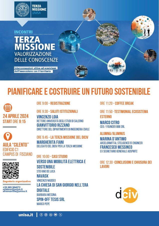 Il CEO Marco Citro ha partecipato come relatore all'incontro della terza missione del 24 aprile 2024 presso il Dipartimento di Ingegneria Civile - Università degli Studi di Salerno.Importante evento accademico sulla terza missione per la valorizzazione delle conoscenze in cui la start up innovativa BBB srl si impegna da sempre. Non si può creare valore prescindendo dalla conoscenza e investire in R&D in un mondo che cambia velocemente è dirimente per innovare ed essere sempre più sostenibili, valori essenziali per BioBuildingBlock